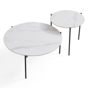 Elegance meets simplicity in the Bianco coffee  side table set. Sintered stone tops with white stone marble tops, sleek black steel legs. Two versatile tables of varying heights and sizes offer a customisable solution to suit your spatial needs.