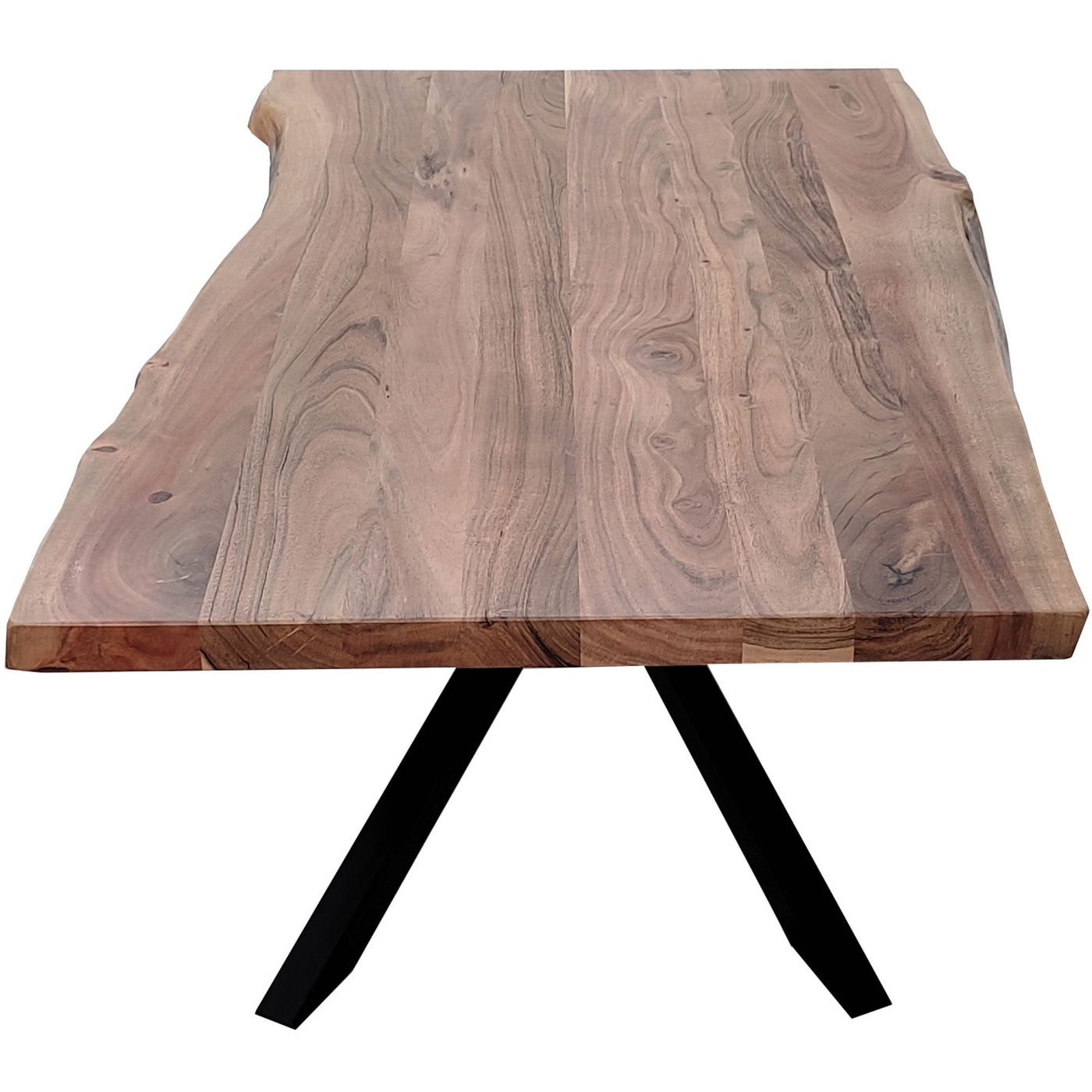This multi-colour coffee table is a lovely piece of furniture. Place a flower vase on it and spread positive vibes in your room. The table looks exceptionally lovely as it is made of sustainably harvested Solid Acacia timber with natural grain patterns. The Live edge tabletop in its organic form celebrates the natural grain patterns inherent in Acacia timber, giving the table a natural beauty. The tabletop is solid 38mm thick. Painted in a natural finish, the tabletop is paired with black steel legs in a cross design. The elegant coffee table has a one-of-a-kind design with a tabletop and legs in different colours and styles. A one-year warranty is included with the simple-to-assemble coffee table.