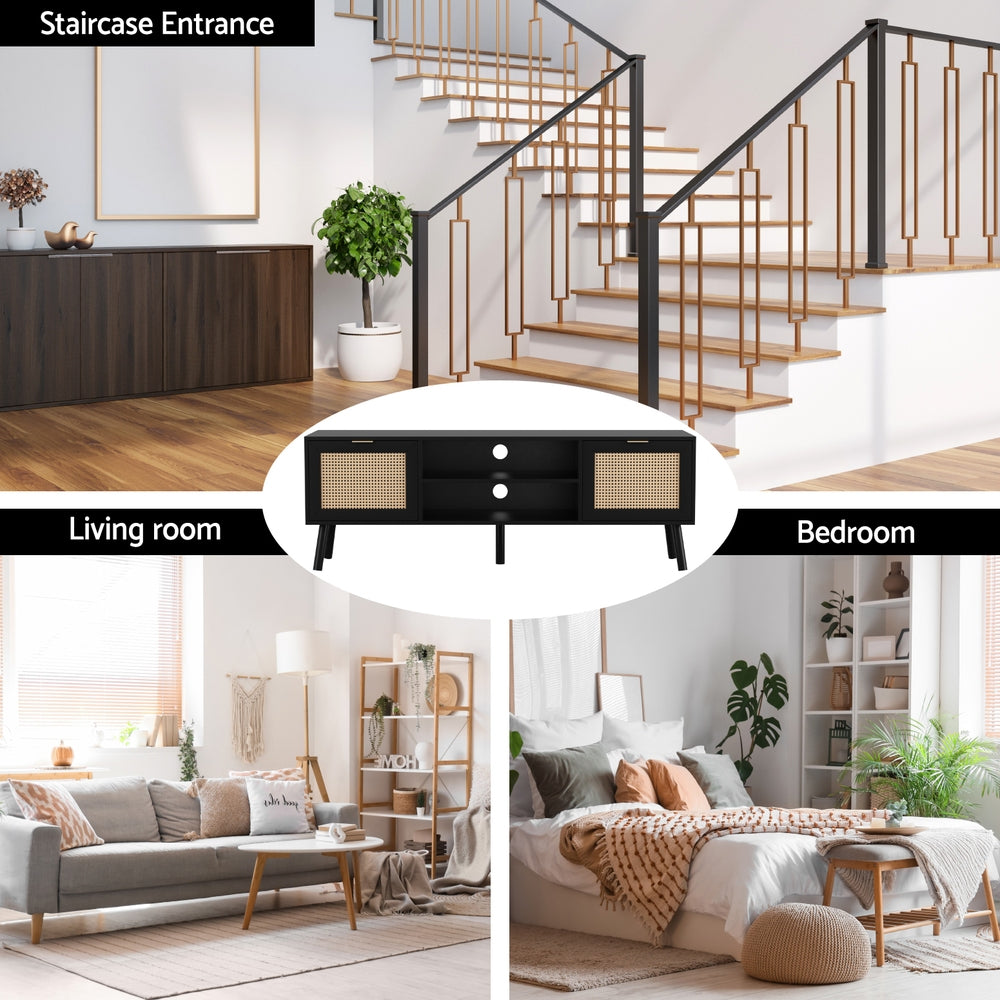 Artiss premium TV unit combines 2 side cabinets with 2-tier middle shelves, featuring golden metal handles and soft-close hinges. Crafted from E1-grade 15mm particle board with paper veneer finish, this sturdy black unit (150Lx40Dx52H/cm) supports 40kg tabletop capacity. Includes anti-tip kits, cable management holes, and solid wood feet with pads. Effortless assembly and wipe-clean surfaces ideal for living room entertainment setups.