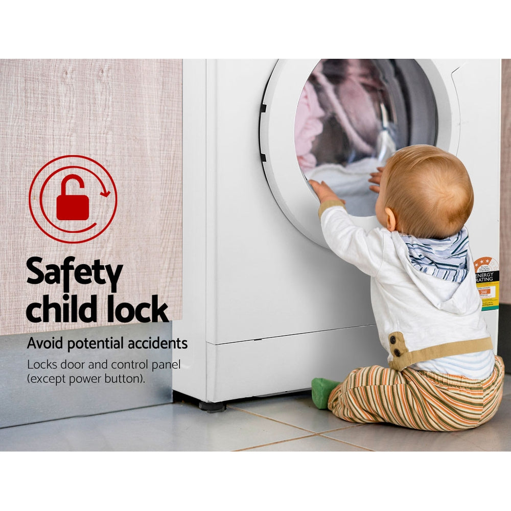 With up to 8kg of washing capacity, our Devanti Front Load Washing Machine certainly makes light work of your washing. Choose from 15 programs to suit your requirements, including useful 18-minute quick wash and anti-allergy modes. To save on energy bills, you can also delay start up to 24 hours to do your washing during off-peak hours. Other great features include hot water washing of up to 90°C water temperature, LED display screen and a very efficient and effective spin speed of 1400rpm. The large opening facilitates easy loading and unloading, and a child-lock feature also ensures that the front door and control panel will be locked from accidental tampering by any child. Not least, the washing machine has energy and water ratings of 4 stars and is SAA-approved for Australian usage.