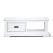 This sleek and beautifully designed 1-drawer and 1-niche coffee table is composed of sustainably sourced Solid Acacia and MDF. The wood ensures the strength and durability of the coffee table for years to come, taking care of your storage needs. The coffee table is angled just at the right places to maximize its clean line aesthetics.Designed in the coastal style, the centre table features a minimalist, functional, and contemporary design. Due to the vivid white colour, it exudes a serene feel in the atmosphere, which helps in creating truly joyful moments with your family. The coffee table comes with a one-year warranty.