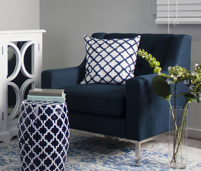 This embroidered cushion features a four leaf shaped pattern. Made of 60% feather 10% polyester & 30% cotton in colours of white & blue.